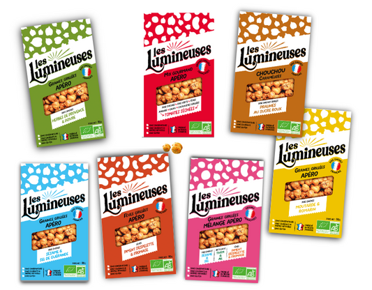 Gamme gourmande et saine de produits de snacking sucré et salé à base de légumineuses françaises: graines grillées apéritives délicatement enrobées d'épices, houmous, crèmes gourmandes pour le goûter...